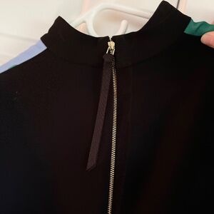 100% polyester fabric with a lovely weight to it.There is a fairytale inspired forest creatures print on the front with contrasting black short sleeves. The back is black with an exposed zipper and “pull”.