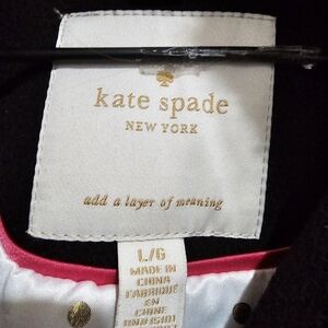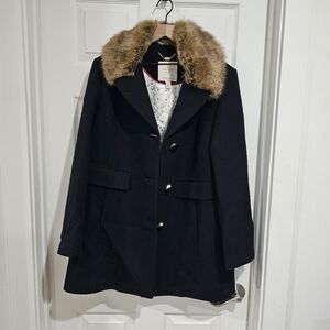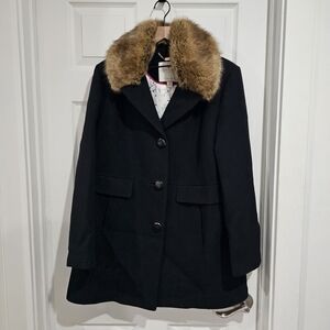 A wonderfully soft wool blend is accented with a cozy faux-fur collar in this pretty peacoat from kate spade new york. Wing collar; removable faux fur collar. Single-breasted button closure at front. Slit pockets at hips; flap pockets at hips. Lined with polka dot print. Hits at mid-thigh; approx. Length: 34". Slit at back hem. Shell: wool/polyester; lining: polyester/spandex; faux fur: modacrylic/polyester. Dry clean. Color: black