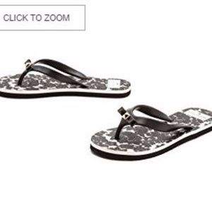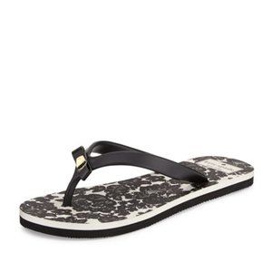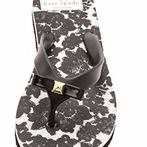 A trompe l'oeil lace print details the foam footbed on rubber Kate Spade New York flip-flops. A gleaming pyramid stud accents the patent bow. Rubber sole. Style # KATES40631