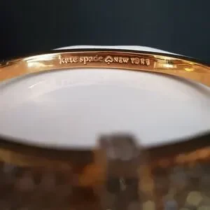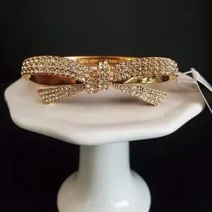 Kate Spade Finishing Touch Bow hinged bangle is gold plate with pave crystals all around. 6 1/4 inches around inside with a strong locking clasp. New with tags.