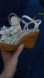 Step into spring and summer in these stunning and sold-out Kate Spade Fiori platform sandals. Featuring delicate pale pink patent leather flowers, a glossy wicker platform, and buttery-soft sheep napa lining, these heels are the epitome of feminine luxury. The gold-tone ankle buckle is engraved with “Kate Spade,” as are the soles and bottoms—pure designer detail from top to toe.