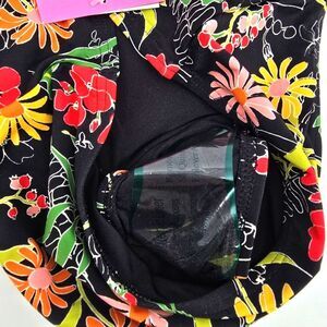 Vibrant floral high-waisted bikini bottom. Features red, yellow, and orange flowers on a black background.