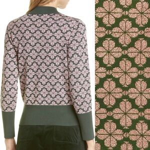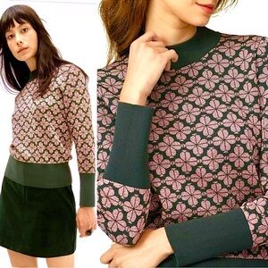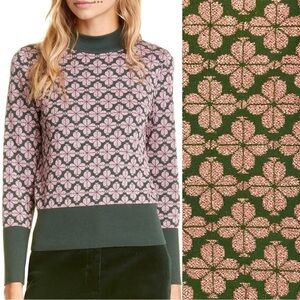 Kate Spade New York Flower Top. Size Small. Pullover. Mock turtleneck. Long sleeves. Contrast solid green ribbed knit at neckline, wrists and waist. 60% Cotton; 26% Polyester; 14% Metallic Fibers. Nice, pre-used condition.