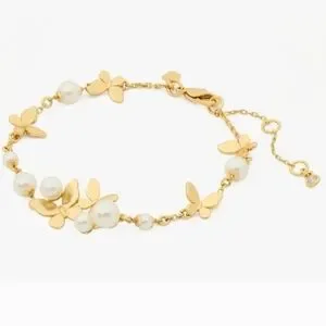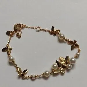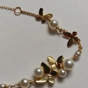 Elegant gold-tone bracelet featuring pearl accents and delicate butterfly charms. The gold finish and white pearls create a refined, feminine look. Perfect for everyday wear or special occasions.