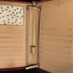 Chic fuchsia leather clutch by Kate Spade. Elegant design with logo detail.