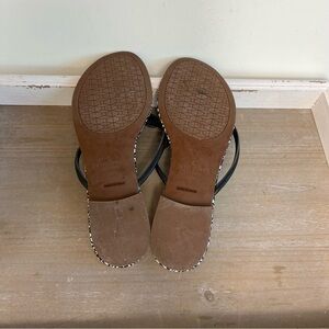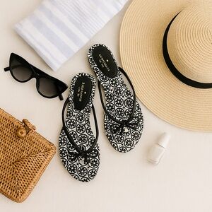 Stunning Kate Spade New York sandals in size 10M. Eye-catching black and white geometric tile print with thong-style strap, bow detail, and gold spade charm. These elevate any warm-weather look — from linen sets to breezy beachwear. Gently worn with light sole wear, uppers excellent.