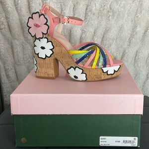 Vibrant platform sandals with floral accents. Features multicolor straps and cork heel. Ideal for a bold look. New- never been worn.