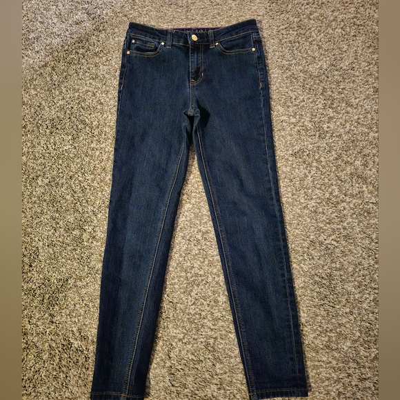 Super Cute Kate Spade New York Five Pocket Skinny Dark Wash Jeans with Gold Hardware and Gold Spade on Back Right Pocket. These Jeans have a Comfortable Stretch with 67% Cotton/30% Polyester/2% Elastane/1% Other Fibers. Stretch In Excellent Condition.