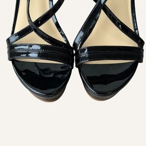 They feature a platform sole, a wrapped wedge heel, and multiple thin patent leather straps, including an adjustable ankle strap with a buckle closure. Chic glossy black color and a sleek design with comfortable fit. Wedge height is 3in.