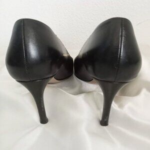 Kate Spade Black Leather High Heel Pumps Embellished with Polished Gold Metal Bow Detail on the Toe. Comfy cushioned instep, top stitching detail and 3" heels. Beautiful,classic styled shoe appropriate for any occasion. Tag Size: 7 B * 7B. Good Overall Condition. Light surface wear, see photos for details.