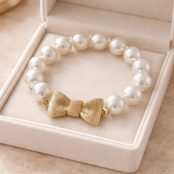Chic bracelet with glossy pearls and a gold bow. Ideal for elegance.