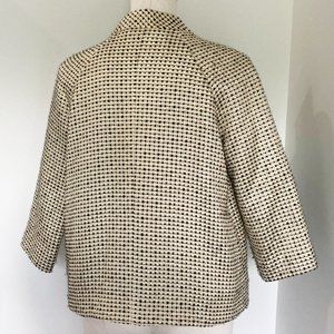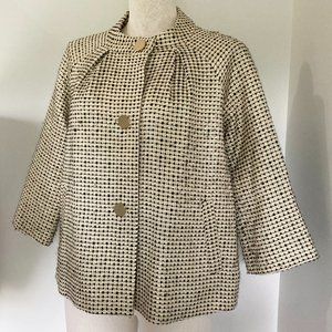 Shine bright in this short Kate Spade jacket! It's the cutest shape with pleats in the front, almost vintage looking. Darling buttons, pockets and polka dot lining. Cropped sleeves would be cute with fun gloves! Some scratches on the buttons but hardly noticeable. At first, it looks like the woven fabric is pilling a little but I think the fabric is just naturally loose since it's wool. There is a couple lines that are a little pulled but again hard to notice, check out the photos. It's a great jacket that you can dress up or wear with jeans. Questions? Just let me know!