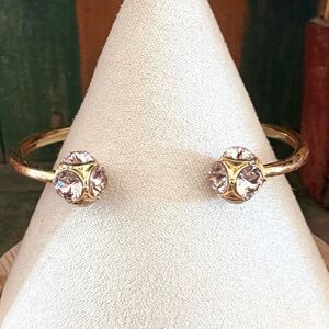 Elegant Kate Spade open cuff bracelet in a shiny gold tone finish, featuring clear light pink crystal rhinestone ball ends. Clean, minimal design with just the right amount of sparkle — easy to dress up or wear every day. This is a genuine Kate Spade piece and looks beautiful stacked with bangles or worn solo for a chic, polished touch.
