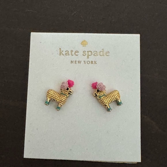 Charming gold pinata earrings by Kate Spade. Features pink and green details. Adds a playful touch.
