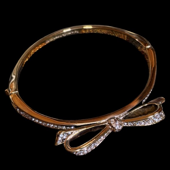 Chic gold-tone bracelet with signature branding. Ideal for stylish accents. This bracelet has a push lever for easy opening. It is adorned with lots of crystals to give it sparkle. Never worn. Comes with original drawstring pouch. Like the item but not the price? Send me an offer. Five star seller with quick shipping! ✈️