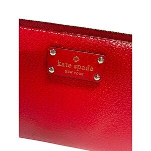 This Kate Spade women's wallet features a vibrant red pebbled leather exterior that combines durability with a chic, stylish look. The front proudly displays the iconic Kate Spade New York logo on a metal plate, accentuated by silver-tone studs for a touch of elegance. The large zip-around design ensures your essentials are securely stored while providing easy access.