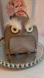Adorable gray backpack with owl face. Features fluffy eyebrows and gold accents.