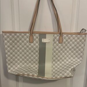 This elegant Kate Spade tote bag showcases a sophisticated gray and cream geometric pattern, perfect for adding a touch of class to any ensemble. With its spacious interior and structured design, it offers both style and functionality for everyday use. The bag's luxurious leather handles and trim add a refined finish to this must-have accessory.
