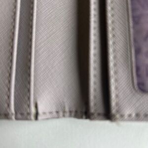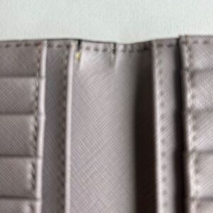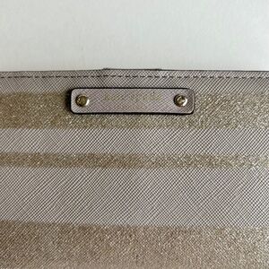 Kate Spade Grey Gold Crossgrain Leather Wallet. 6.5”L x 3.5”H x 0.5”D. Four compartments, twelve card holders, snap closure, one ID holder, one zipper pocket. In good condition, gently use a few times small scuffing, a few tears on the corners (see pictures).