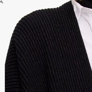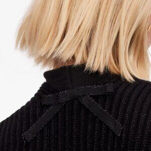New with tags, this ruana wrap is the perfect accessory to keep you warm and complete any outfit. A slight sparkle in the threading and the bow detail in the back makes a simple black wrap into something special.
