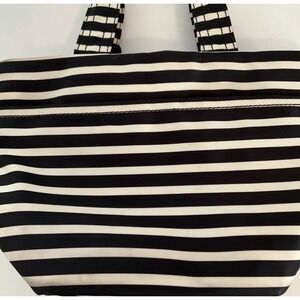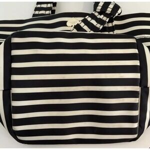 Kate Spade Hana Flatiron Handbag - Black White Stripe with Bow - Multiple Pockets - Measures Approximately 15x9x7 - Pre-owned Condition - There a spot of wear on the bottom as circled in last photo