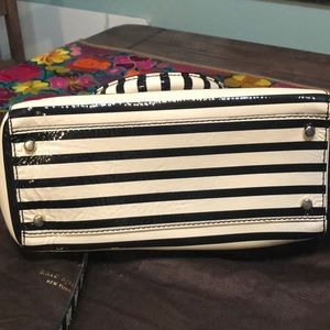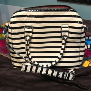 Black and white patent leather striped handbag. Used but in good condition. Cross body strap is removable. 10” long x 9” high and 4” width.