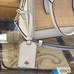 White Leather/Tan Woven Straw 10x8x5, like new! Adjustable strap which measures 50 inches when fully extended.