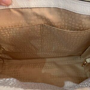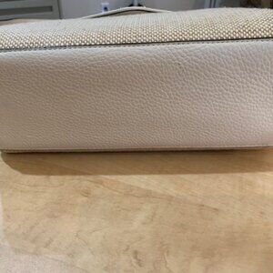 Kate Spade purse. Bone leather and woven cloth. In addition to short handle there's an additional 22" strap drop (longest point). 10 1/2" wide. 9 1/2" tall. ody 42.8% Polypropylene, 28.6% Acrylic, 28.6% Cotton. Trim 100% leather. Lining 100% Polyester.