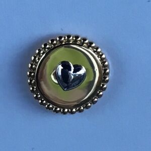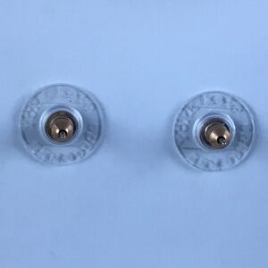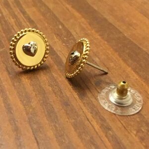 These Kate Spade stud earrings, called “Heartful,” have silver hearts against a round goldtone disk edged with tiny gold beads. They are almost 1/2” wide and have a polished finish. These are sold out on the Kate Spade website. Originally $69.