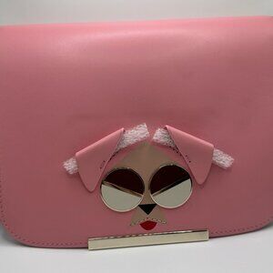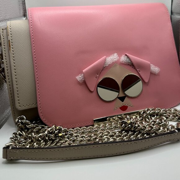 This bag is retired and hard to find!! Kate Spade Heritage Make It Mine Camilla Bag. The top flap snaps off and can be interchanged with other compatible Kate Spade Heritage Make It Mine Flaps. This listing includes the bag with shoulder strap, pink Kate Spade dog flap, and an additional shoulder strap. This set is preowned and has signs of use. The bag has some spots on the exterior, such as a yellow spot at the top corner on the front of flap, inside top of flap and small indents on the back from storage. The metal hardware has some minor scratching. The interior looks good overall but does have a yellow manufacturers glue spot. The pink flap has a square crease on exterior from storage. If you have questions let me know!