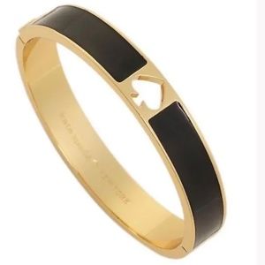 Crafted from 14ct gold-plated metal & polished with the signature Kate Spade logo cut-out to the centre, eagle-eyed fashionistas will have no trouble guessing the designer behind this chic piece. 14 ct gold-plated metal, enamel Measurements: diameter - 5.8cm, width - 1cm Gold-tone metal and black enamel hinged bangle with a cut-out spade design to the top and magnetic fastening. Color: black, gold-tone