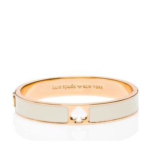 This gorgeous enamel bangle bracelet features an iconic cut out spade for signature Kate Spade classic style. • Hinged bangle bracelet with cut out spade and enamel acetate inset. • Signature logo engraved on inside. • Hinged closure • 2.5'' diameter • Perfect for stacking or wear alone.