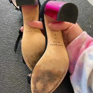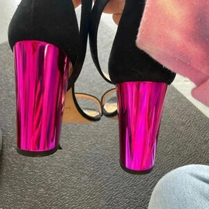 Kate Spade sandals, black suede heels, pink metallic block heel, designer shoes, statement sandals, ankle strap heels, chic summer shoes, bold party shoes, luxury footwear, holidays, valentines, galentines