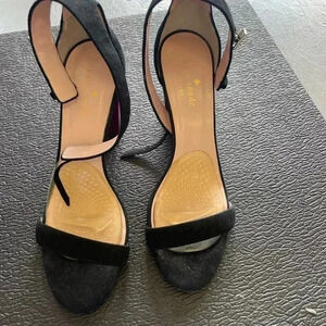 These stunning Kate Spade sandals combine classic elegance with a bold twist. Featuring a black suede upper, a secure ankle strap with gold-tone buckle detail, and a striking pink metallic block heel, these shoes are perfect for making a statement. Whether for a night out or a stylish addition to your everyday look, these sandals are a chic choice. Lightly worn, with minimal signs of wear on the sole and footbed.