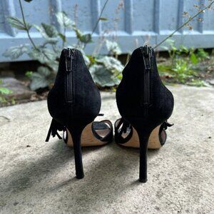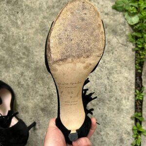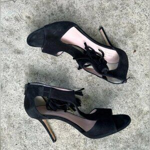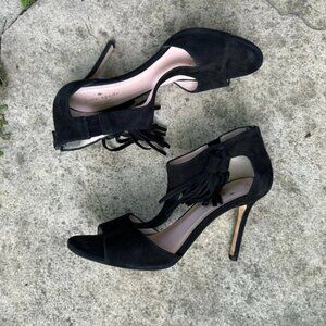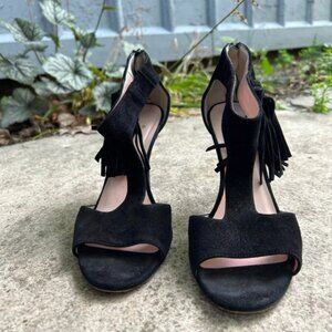 Kate Spade Inga Black Suede Tassled High Heeled Sandal. Fun boho classy option. T strap, zippered black.