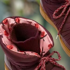 Kate Spade's Cocoon Insulated Winter Snow Boots are high-top boots made with puffy tech uppers, smooth tonal leather trim, and knitted sock linings. They also have floral linings and an insulated puffer style.