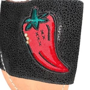 Super cute Kate Spade slides with embroidered chili pepper with beading and rhinestones.