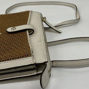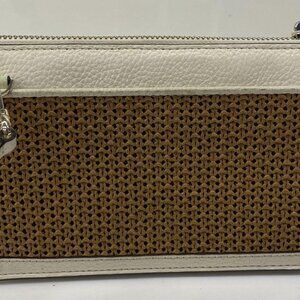 7.7" length x 4.5" height x 1.2" depth Strap Drop 21" adjustable Warm Gingerbread coated straw and white pebbled leather Zip Top closure Large slip pocket on backside; pocket w/think flap on front
