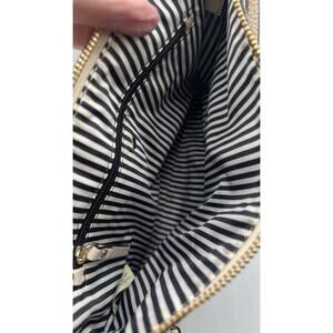 The Kate Spade Jackson Street Gabriele Peppled Leather Crossbody in Brownstone Tan is a stylish and versatile handbag designed for women. It features a rectangular shape with a zip closure, a black crossbody strap, and gold hardware accents. Made of leather with a pebbled finish, this medium-sized bag is perfect for various occasions such as travel, parties, casual outings, and business meetings. The tan brown exterior color and white and black striped lining add a touch of sophistication to this designer handbag from Kate Spade.