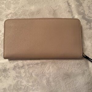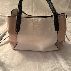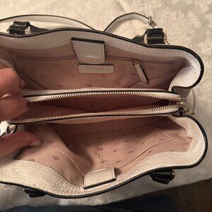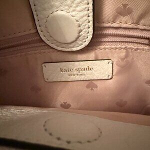 This beautiful Kate Spade Satchel and matching zip-around wallet in neutral cream/pale pink color block is made of pebbled leather - making it soft but also providing structure. The bag's three interior compartments are spacious, with a pocket for your cell phone and a full-zipped compartment for added security. The bag also has a magnetic tab center closure. The bag comes with an adjustable crossbody strap, along with the dual top handles, for versatility.