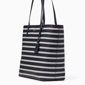Crafted in smooth, durable material with crisp navy and light blue/grayish stripes, this spacious carryall combines classic style with functional ease.