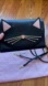 This is the perfect bag for any cat lover! Made of leather. The exterior has the silhouette of a cat face. The interior has multiple card slots and a zip pouch.