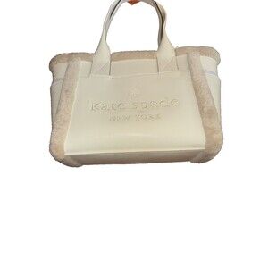 The Kate Spade Jett Faux Shearling Fur Winter White Meringue Logo Large tote bag is a stylish and cozy accessory for the winter season. Made of faux leather with a luxurious shearling lining, this bag features an embroidered logo accent and a cute top handle. The winter white and meringue exterior color combination adds a touch of elegance to the casual occasion this tote is perfect for. With its spacious size and chic design, this handbag is a must-have for any fashion-forward woman.