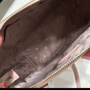 Solid glitter fabric lining. Two way Spade trim. Saffiano pvc. Two interior slide pockets. Kate Spade lining. Zip closure. Adjustable detachable cross body strap. Handles with 5" drop.