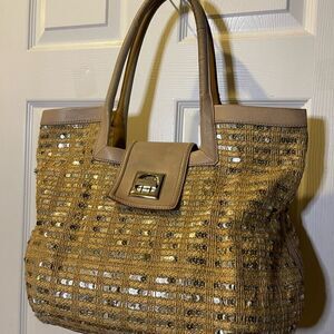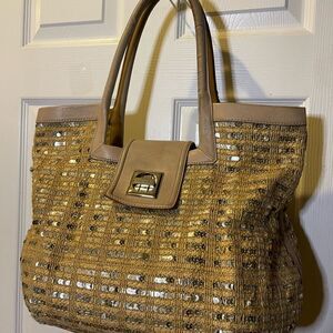 Kate Spade Jute and sequins Tan & Gold shoulder bag leather beige straps & trim flop top with turn lock closure the inside lining has a side zipper and two side pockets. Pre owned in good used condition signs of wear on the leather straps has some discoloration see all pictures any questions please message.V1