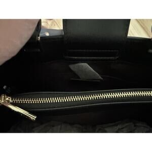 This Kate Spade Reegan crossbody bag is a stylish accessory for any occasion. The black leather exterior is accented with a zipper and gold-plated hardware. The bag has double handles and an adjustable detachable strap, allowing for versatile carrying options. The interior is lined with two-way script logo lining and has enough space for essentials. The bag is medium-sized with a width of 11.36 inches, a height of 8.9 inches, and a depth of 4.8 inches. The Charlotte character and Kate Spade logo add a touch of designer flair to the bag. This bag is perfect for formal events, workwear, or business settings.