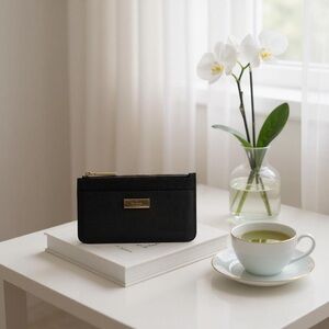 Elevate your everyday style with this limited edition Kate Spade Kenzie card holder Black in color. Featuring a sleek saffiano PVC design and 2-way script logo lining, this large slim card holder is perfect for storing credit cards, concert tickets, and more.