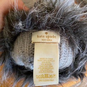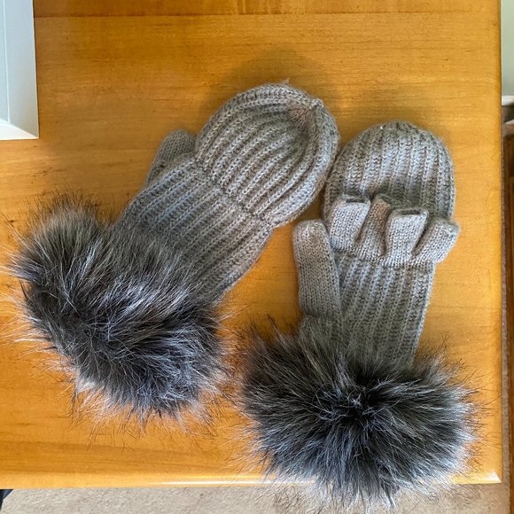Kate Spade Knit Gray Wool Blend Convertible Fingerless Gloves W/ Faux Fur Trim.
