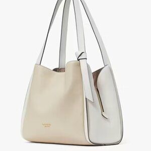 Gently used Kate Spade Knott Color-blocked Large Shoulder Bag on beige/white. Great look, lots of storage options with interior zipper and snap close pockets.