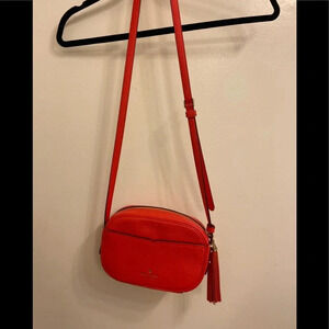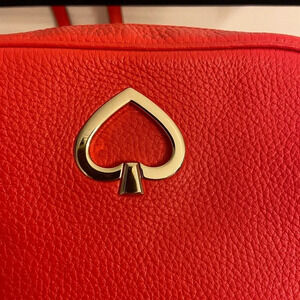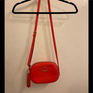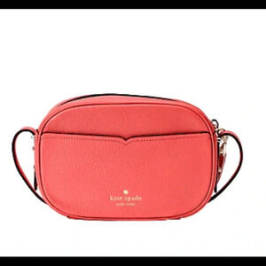 Kate Spade Kourtney Camera Bag Pink Spotlight. Pebbled Leather. Overall in good condition. There are pen marks on the inside. One medium sized pocket and one pocket made for cards on the other side. There is one small dark spot on the back (please see pic) Edges are in good shape no rubbing, There are some faint scratches on the silver spade. Adjustable strap. Measures: 5.3" H x 8.07" W x 2.36" D. Please ask any questions!